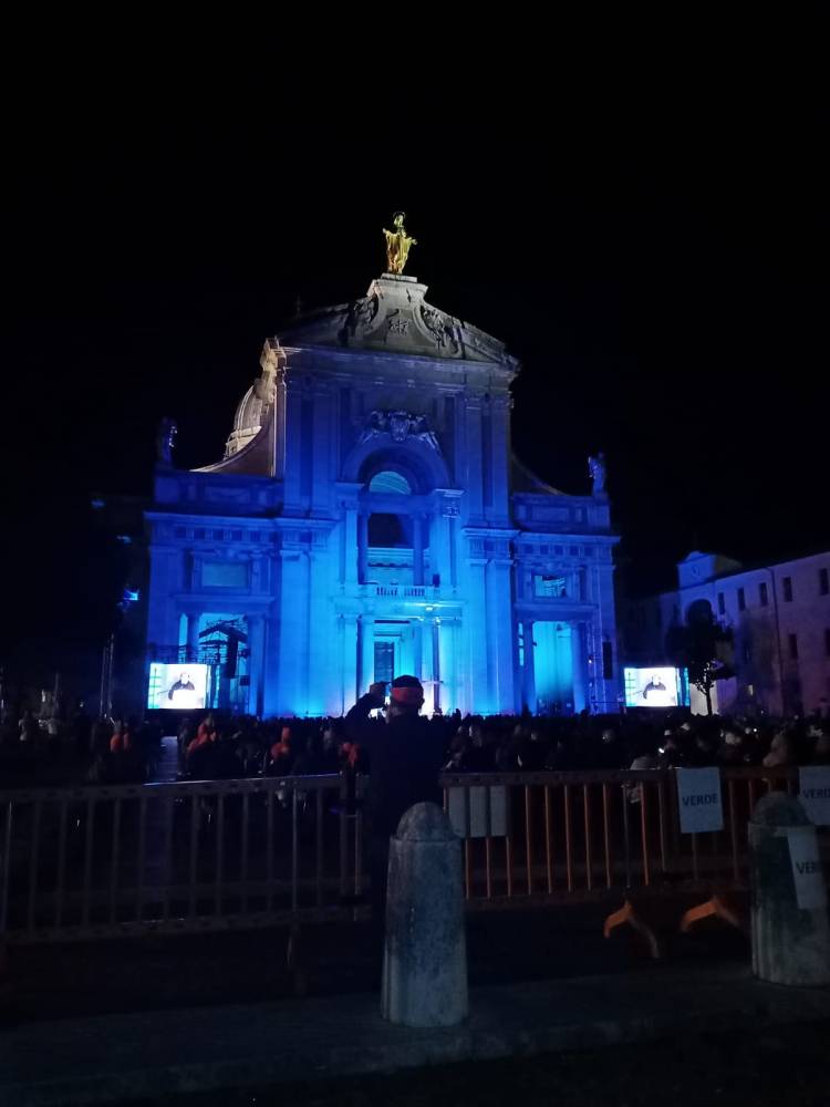 Am Freitag Mittag begann dann unsere Fahrt nach Assisi. Mit einem Leihwagen, einem Volvo, sind wir direkt nach Assisi gefahren. Naja, ganz direkt war es nicht: Wir haben einen kleinen Umweg über den Vesuv gemacht 🙂 (grins). Vor lauter Aufregung haben wir nämlich die Ausfahrt nach Assisi verpasst, so dass wir einen Umweg von einer Stunde gemacht haben. Leider war es dunkel und von Italy by night haben wir auf dieser Route nichts gesehen. Aber gut, unsere Unterkunft ist nicht weggelaufen, und nachdem wir sie endlich gefunden hatten, legten wir schnell unsere Sachen dort ab, machten uns ein wenig frisch und fuhren anschließend zum Vorort Maria degli Angeli. Was lag näher, als uns zunächst in einer kleinen Pizzeria zu stärken. Ma che buona la pizza! Mit einer warmen Mahlzeit im Magen machten wir uns auf zu einer kleinen Erkundigungetour. Wir kamen direkt zum Kirchplatz der Basilika, in der die Porziuncola steht. Das ist die Kapelle, die der heilige Franziskus wieder aufbaute, nachdem er von Christus die Worte hörte: „Franziskus, geh und baue mein Haus wieder auf, das, wie du siehst, ganz und gar in Verfall gerät.“ Vor der Kirche waren große Leinwände aufgestellt und es lief gerade ein Festival zu Ehren des neuen Seligen. Es wurde ein Ballett aufgeführt, anhand dessen die Geschichte von Carlo Acutis erzählt wurde. Zwische den Tanzeinlagen traten verschieden Leute ans Mikrofon und gaben Zeugnisse. Als wir kamen, erzählte gerade ein Herr über seinen Erfahrung mit Carlo und welche Bedeutung er für sein Leben hatte. Er und seine Frau konnten keine eigenen Kinder bekommen, aber sie haben sich sehr großzügig anderer Kinder angenommen, die selbst keine Eltern haben. Es sind Kinder, die alle die eine oder andere Form einer Behinderung haben. So erzählte er beispielsweise von seinem Sohn, der so stark behindert ist, dass er total auf Hilfe von anderen angewiesen ist. Er kann nicht sprechen und sich nicht bewegen, aber jedes Mal wenn sein Vater zu ihm kommt, in der Früh, um ihn zu waschen und anzuziehen, wenn er aus der Arbeit nach Hause kommt, wenn er ihn abends zu Bett bringt, dann lächelt dieser Junge ihm immer zu. Er hat eine tiefe und echte Freude am Leben und an seinen Mitmenschen, mehr als andere, die körperlich ganz gesund sind. Des weiteren hat dieses Ehepaar ein Mädchen angenommen, die aufgrund einer familiären Tragödie ein Bein verloren hatte. Dieses Mädchen dachte, das das Leben mit nur einem Bein für sie nun vorbei sei. Sie fühlte sich sehr hässlich. Aber durch die Liebe, die sie in ihrer neuen Familie erfahren konnte, entdeckte sie erneut das Glück und die Schönheit des Lebens. Inzwischen ist sie selbst verheiratet. Es war wirklich beeindruckend. Mit seiner Geschichte zeigte dieser Familienvater, was auch Carlo Acutis in seinem Leben hat sichtbar werden lassen: die Sorge um die andern und das Bemühen, den Mitmenschen froh zu machen, ist das, was zählt.