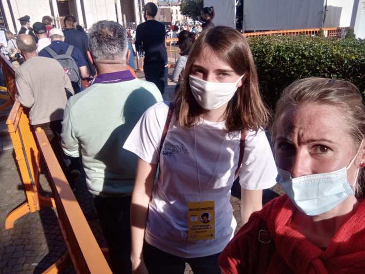 Und dann kam der Samstag, der Tag der Seligsprechung. Raus aus dem Bett, frisch gemacht, gut gefrühstückt und ab zum Kulturzentrum, um unsere Eintrittskarten für die Seligsprechungsmesse abzuholen. Die Registrierung fand in der großen Halle statt, zu der aber jeweils nur eine Person aus jeder Gruppe Zutritt hatte. Sicherheitspersonal achtete gründlichst auf die Ordnung beim Zutritt in die Halle und in der Halle. Allerdings knuddelten sich die Leute vor dem Eingang in einer langen Schlange und man kam sofort ins Gespräch: wir konnten 2 junge Frauen aus Brasilien interviewen, dem Land, indem das entscheidende Wunder geschehen war. In einem kleinen Dorf in Brasilien war nämlich ein Junge von einer Missbildung eines inneren Organs geheilt worden. Der Pfarrer der Gemeinde hatte eine tiefe Verehrung zu Carlo und hatte seine Gemeindemitglieder aufgerufen, zu diesem Jugendlichen für eine Heilung zu beten. Und tatsächlich, als der kranke Junge das nächste Mal ins Krankenhaus kam, war die Missbildung einfach verschwunden. Medizinisch ist das nicht erklärlich. Während wir mit diesen beiden jungen Frauen redeten, näherte sich eine andere Frau, die ebenfalls etwas zu erzählen hatte: Sie war eine Freundin der Familie Acutis und hatte Carlo selbst erlebt. Sie erinnerte sich, wie er als kleiner Junge Nachhilfe in Mathematik in ihrem Haus bekam. Allerdings fragte sich alle, warum er überhaupt zur Nachhilfe käme. Er wusste selbst viel mehr als alle anderen.